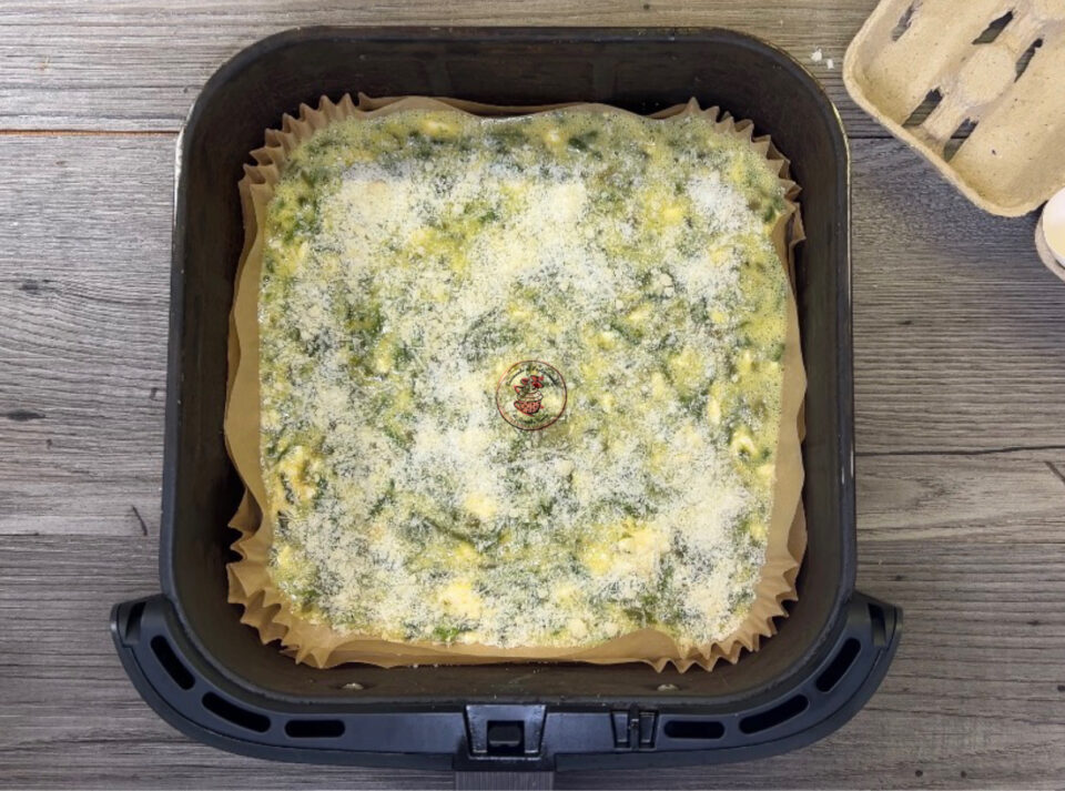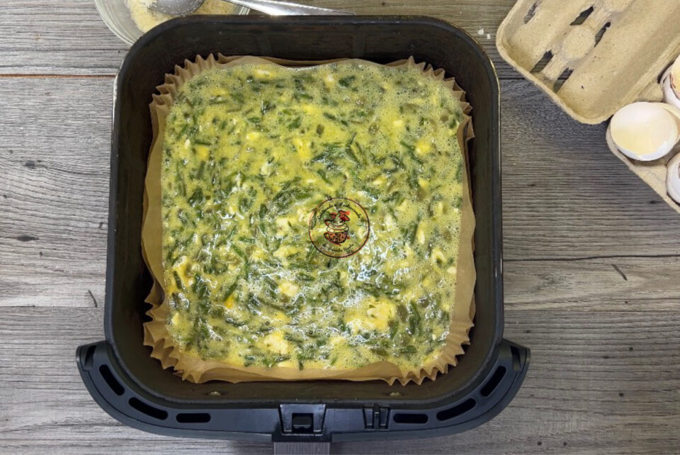 Rivestire il cestello della friggitrice ad aria con la carta forno e versarci le uova.