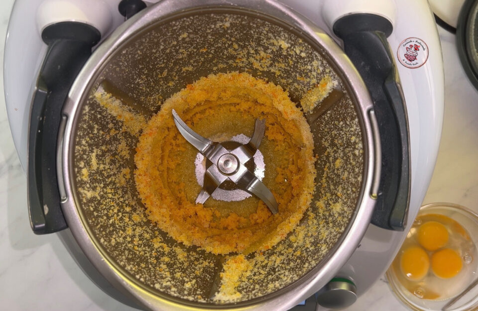 Nel boccale del bimby polverizza per 10 secondi a velocità 10 la scorza dell’arancia con la scorza del limone e lo zucchero.