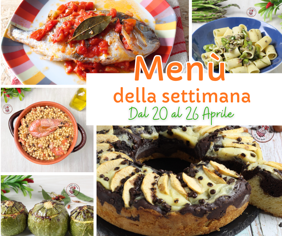 Se non sai cosa cucinare questa settimana, ecco il menù settimanale dal 20 al 26 Aprile con piatti semplici e gustosi per tutta la famiglia! Troverai un primo, un secondo, un contorno e un dolce per ogni giorno della settimana. Non è obbligatorio utilizzarle tutte, puoi scegliere quelle che preferisci in base ai tuoi gusti.