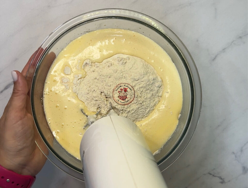 Mischiare il lievito con la farina e aggiungere le polveri al composto di uova.Frullare per qualche minuto, finché il composto non risulta liscio e senza grumi.
