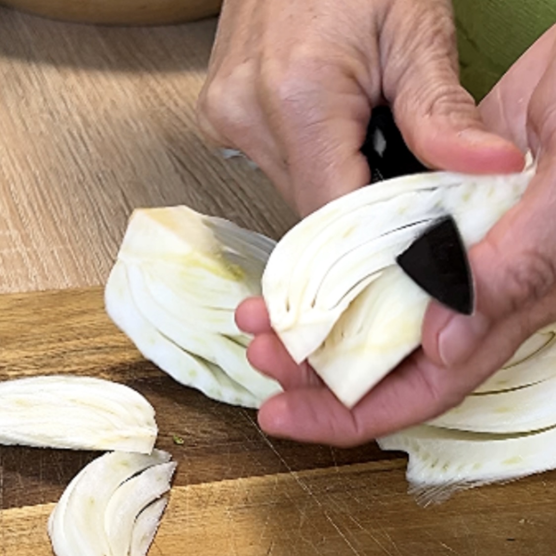 Pulisci il finocchio dalla foglia esterna più dura e taglialo a fettine dello stesso spessore.