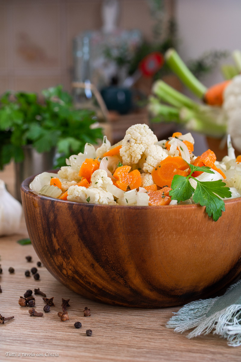 Ogni verdura dovrà essere cucinata separatamente, inizia da quelle più chiare per finire a quelle più colorate quindi partiamo dal cavolfiore e dal finocchio per proseguire poi con il sedano ed infine con le carote.