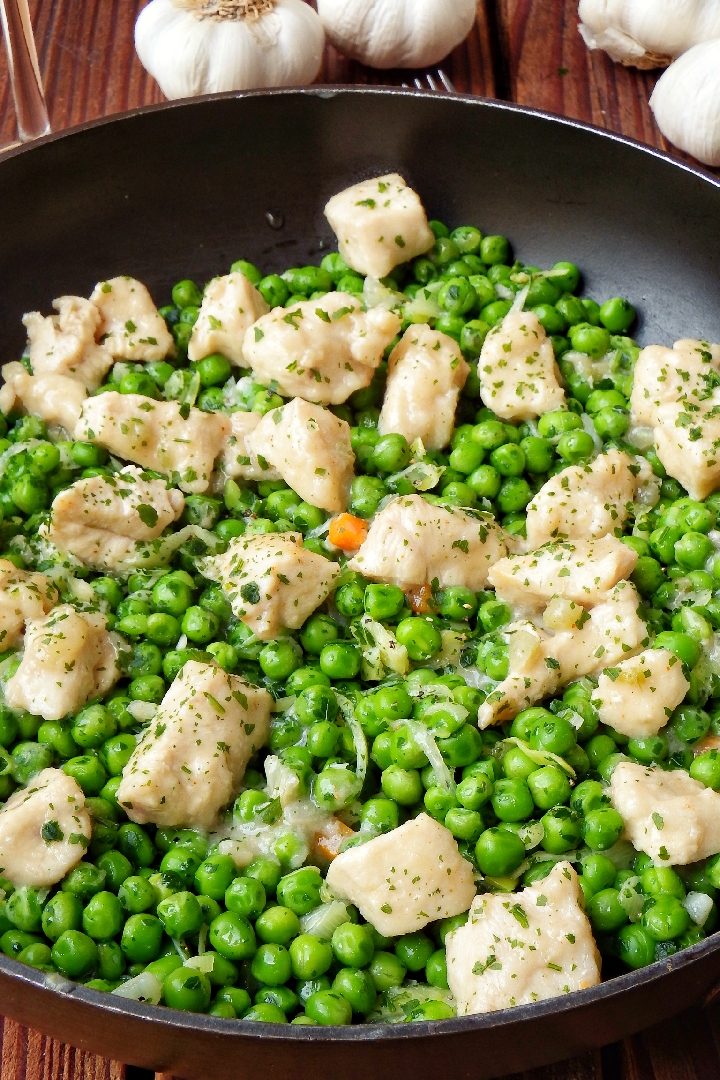 Aggiungi il pollo nella padella con i piselli, mescola per bene, insaporisci con del prezzemolo fresco tritato e servi in tavola. Buon appetito!