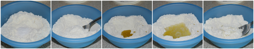 Versate la farina in una ciotola e mescolatela con il sale e lo zucchero; aggiungete l’olio d’oliva, un po’ d’acqua tiepida e iniziate a mescolare con un cucchiaio.