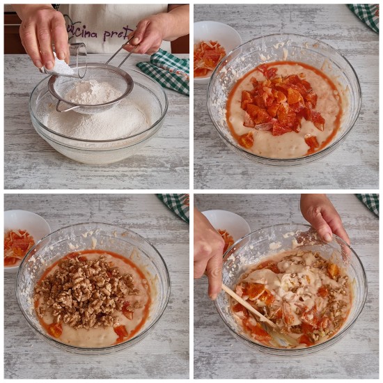 Unite i gherigli di noci tritati in modo grossolano e amalgamate bene il tutto con una spatola o un cucchiaio.