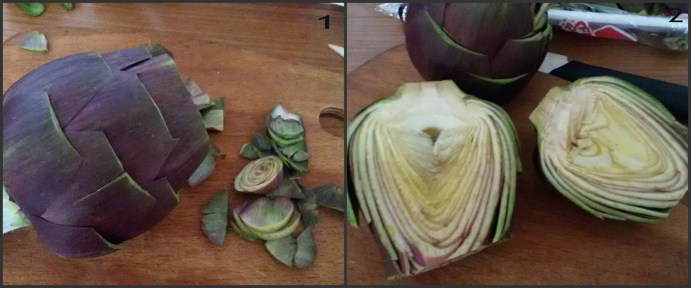 Iniziamo a preparare i Carciofi in padella aglio e prezzemolo pulendo i carciofi, tagliarli a metà ed eliminare tutte le punte ( foto 1 ) ora con l’aiuto di un coltello ben affiliato eliminare la parte centrale della “barba” come potrete vedere nel secondo carciofo della foto 2.