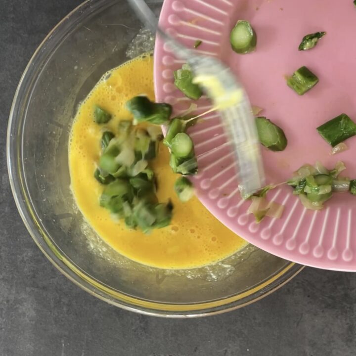 Quando gli asparagi saranno pronti, versateli in un piatto in modo da farli raffreddare e dividete le rondelle dalle punte che serviranno poi per la decorazione finale. Versate le rondelle di asparagi nelle uova,