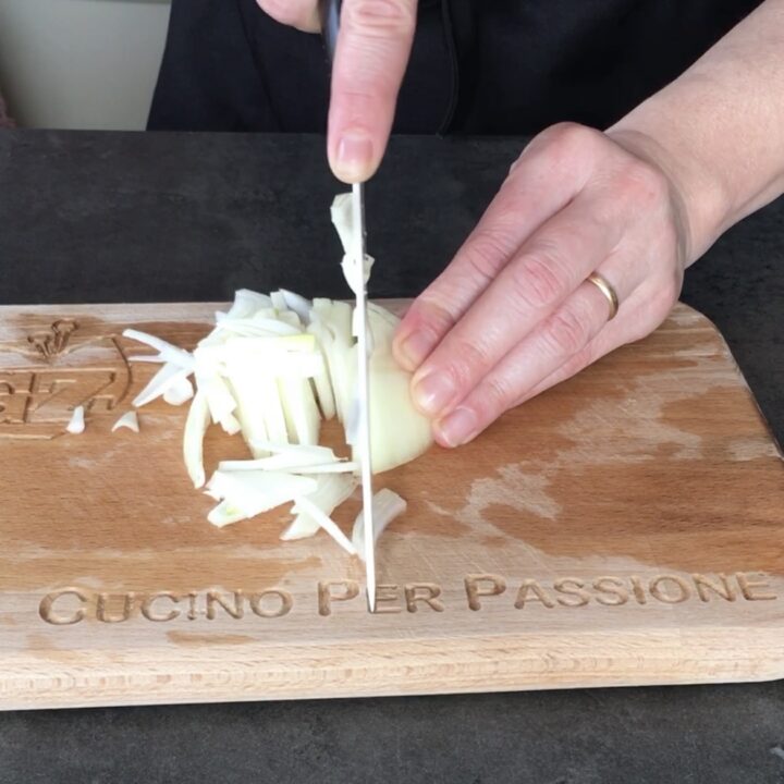 Versate in una padella gli asparagi a rondelle e le punte, unite anche la cipolla tritata,