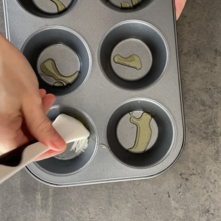 Versate un goccio d’olio nello stampo per muffin e con un pennello spennellate anche i bordi.
