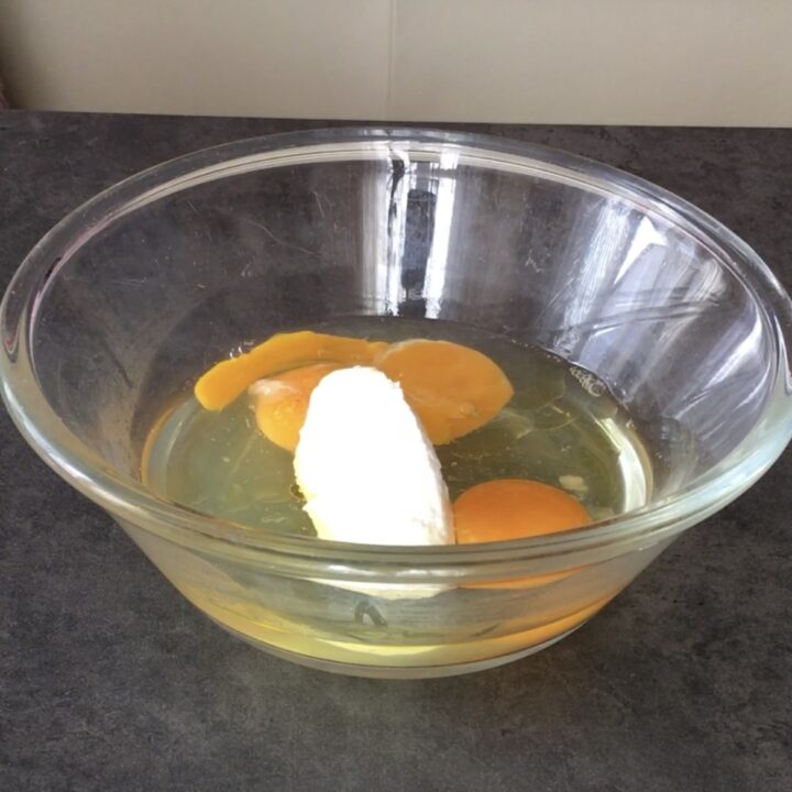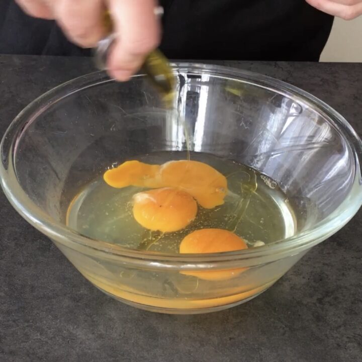 Versate in una ciotola le uova, aggiungete un goccio d’olio e un pizzico di sale,