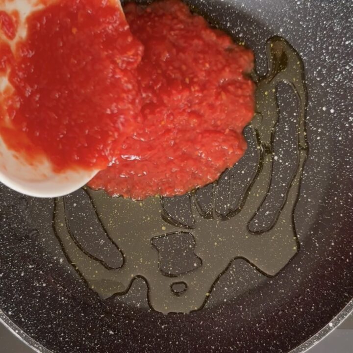 la polpa di pomodoro o dei pelati, uno spicchio d’aglio e delle foglie di basilico, mettete sul fuoco e fate cuocere per 10 minuti.