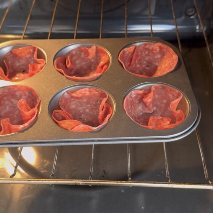 Iniziamo a preparare i Cestini di salame, sistemate le fette di salame nello stampo per muffin, cercando di farle aderire bene ai bordi e alla base,