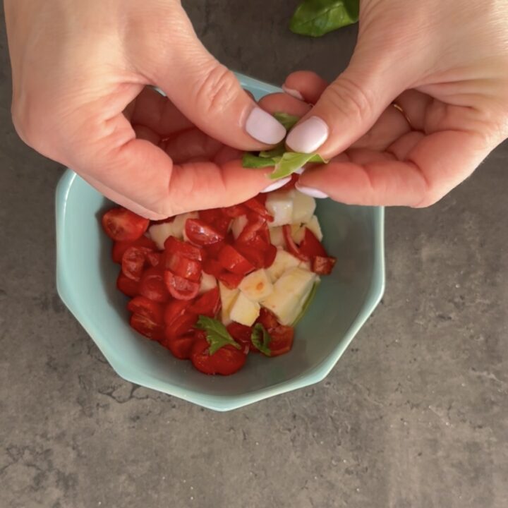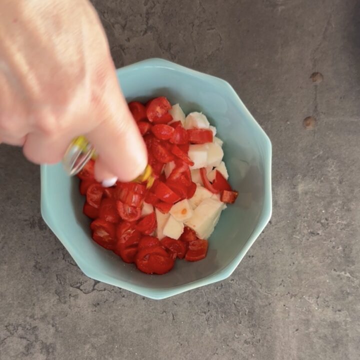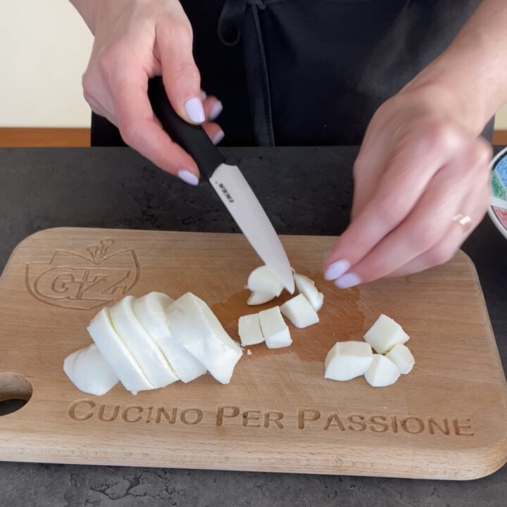 Tagliate la mozzarella a piccoli pezzi e versatela poi in una ciotola,