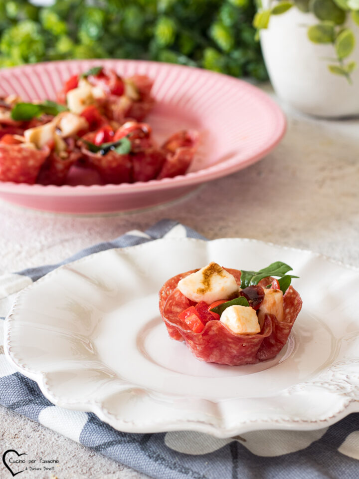 Quando i cestini di salame saranno freddi disponeteli in un piatto,