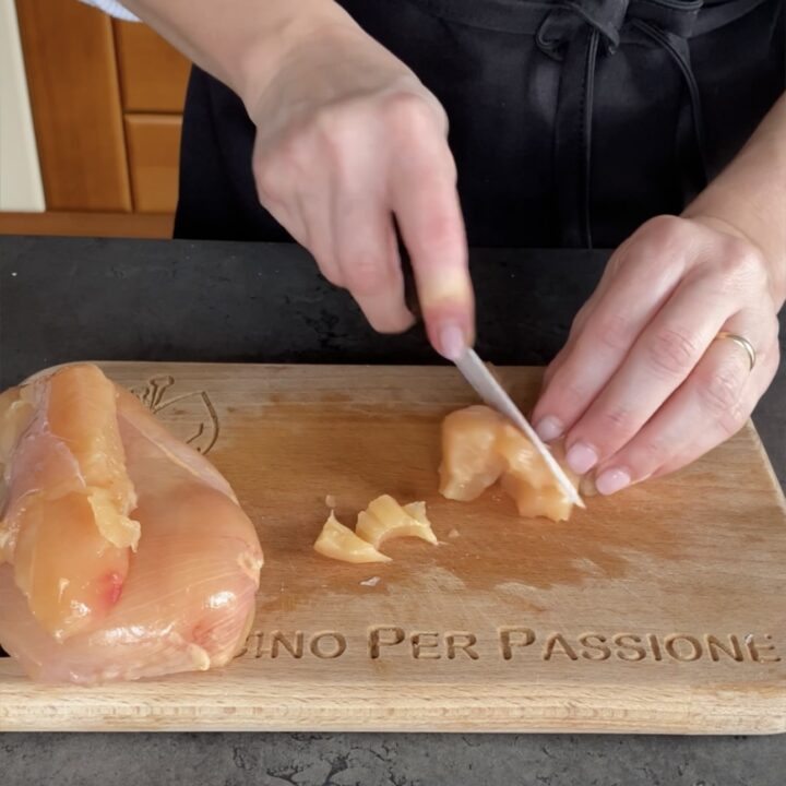 Eliminate eventuali ossicini e grasso dal petto di pollo e tagliatelo a strisce e