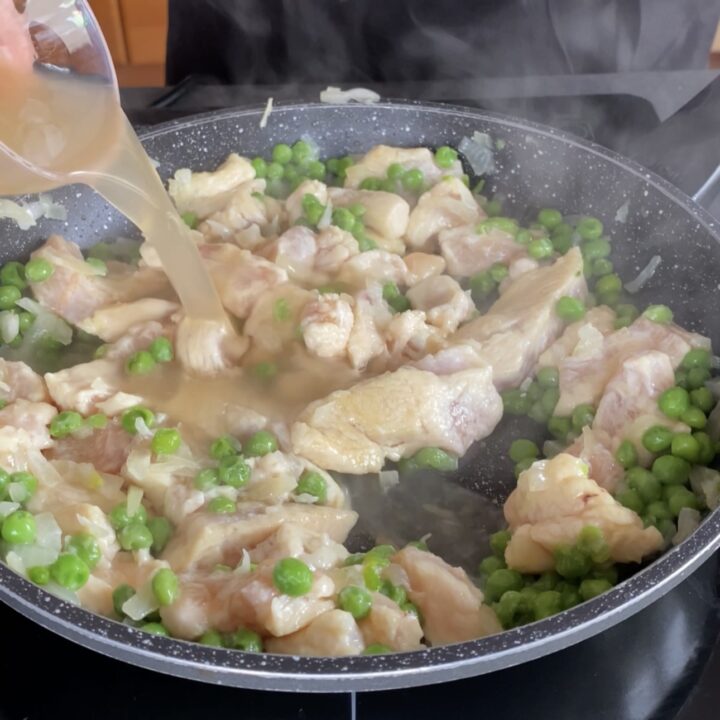 Dopo i 10 minuti di cottura dei piselli, aggiungete in padella i bocconcini di pollo,
