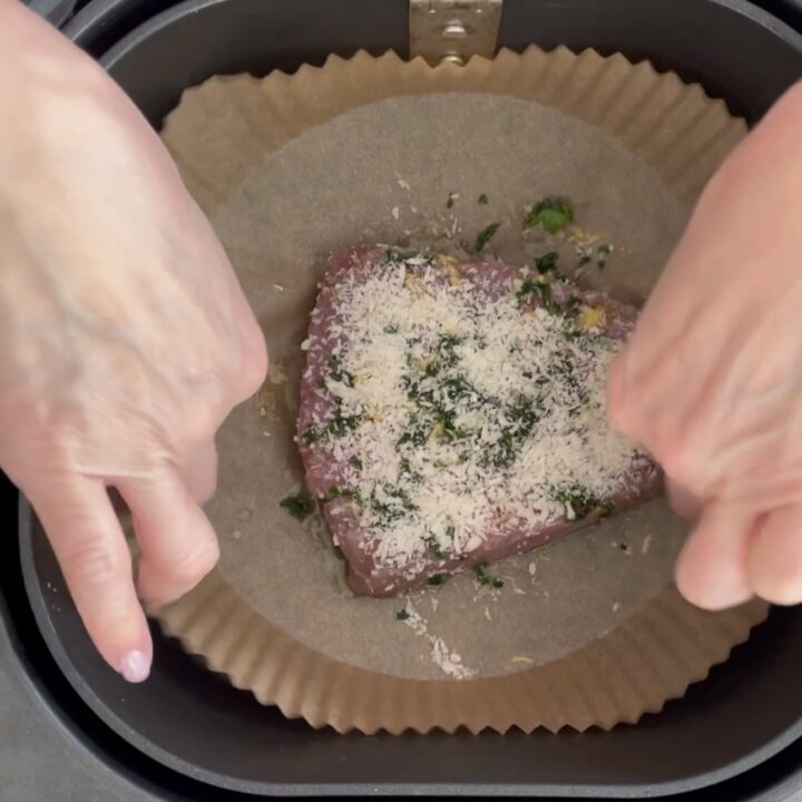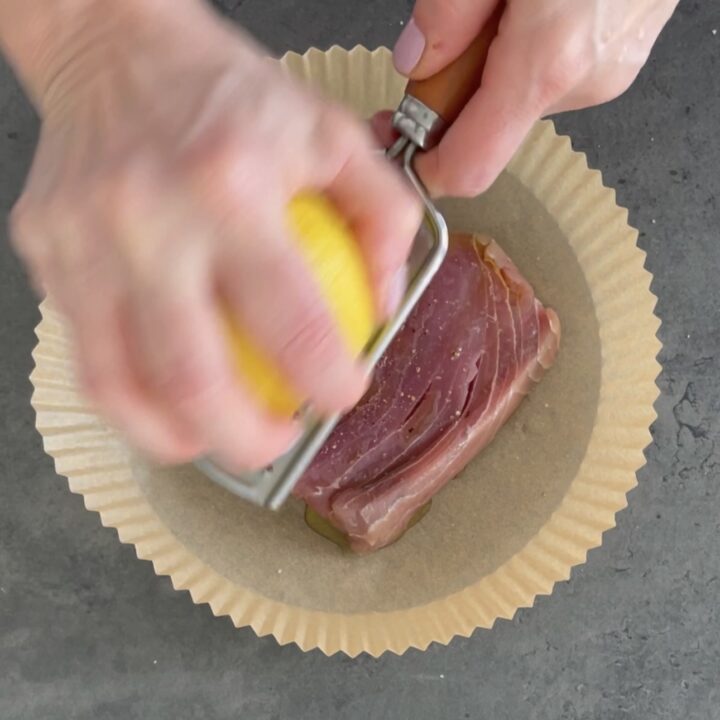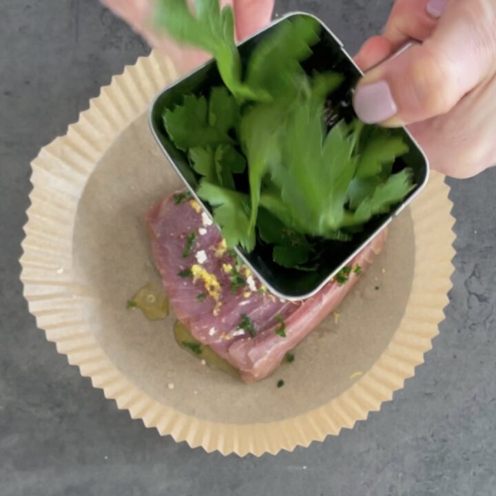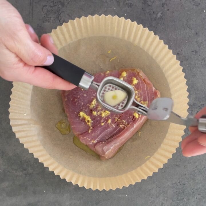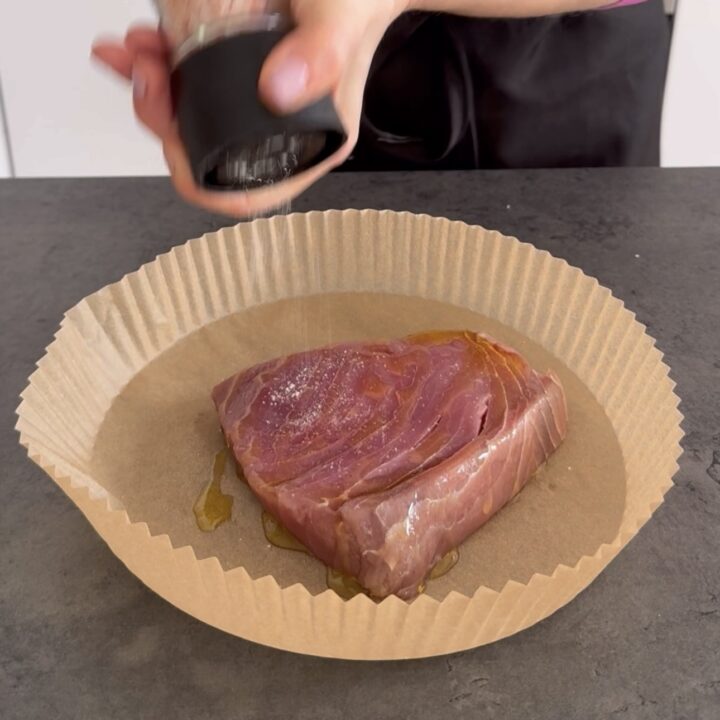 Iniziamo a preparare il tonno in friggitrice ad aria, sistemate il trancio di tonno sulla teglia, aggiungete un goccio d’olio extravergine