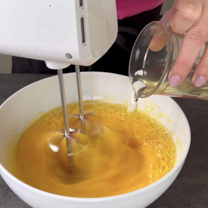 unite poi l’olio di semi di girasole a filo e sempre con le fruste in azione.