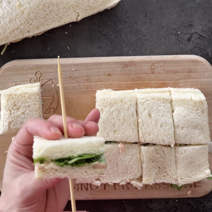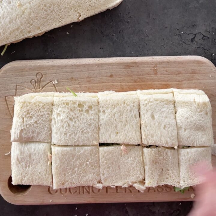 Tramezzini al tonno gustosi e facili da fare sono perfetti non solo come antipasto. Questi serviti come spiedino sono l’ideale anche in un buffet, li ho infatti infilati in uno stecchino e ho messo 5 pezzi, ovviamente poi li potete servire singolarmente o fare degli spiedini di tramezzini con meno pezzi. I tramezzini tonno e olive li potete servire anche per accompagnare un aperitivo sfizioso, io li ho farcite anche con della rucola, potete sostituita con dell’insalata o del radicchio. I tramezzini sono ottimi in ogni periodo e li potete servire anche durante le feste natalizie, io li prepara ogni anno e vi consiglio di guardare tutti i miei TRAMEZZINI PER NATALE troverete sicuramente qualche ricetta da provare oppure guardare anche i TRAMEZZINI ARROTOLATI. Io sono veneziana e da noi i tramezzini sono speciali, non so se li avete mai provati ma se avete occasione di venire a Venezia dovete assolutamente assaggiarli assieme ai cicchetti. Ora andiamo a vedere come preparare i tramezzini al tonno e se li provate fatemi sapere. Barbara