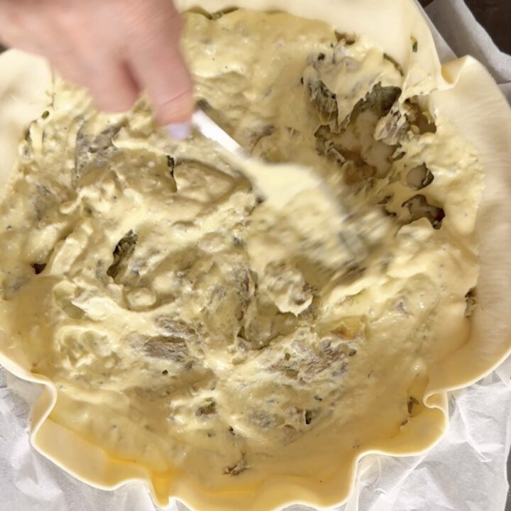 Srotolate la pasta sfoglia e sistematela in una teglia versate il carciofi che prima avete schiacciato, livellateli su tutta la base