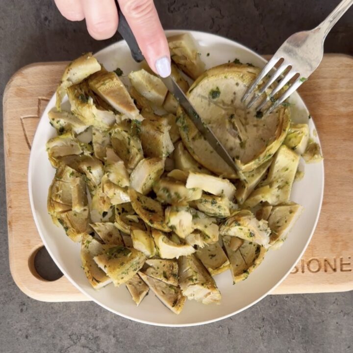 e dell’acqua, coprite con il coperchio e fate cuocere per 20 minuti, ogni tanto girate i fondi o i carciofi ed eventualmente aggiungete dell’acqua se ce ne fosse bisogno. Il tempo di cottura varia dalla grandezza dei fondi o dei carciofi e quindi vi consiglio di verificare la cottura infilando i rebbi della forchetta, se entrano con facilità sono cotti.