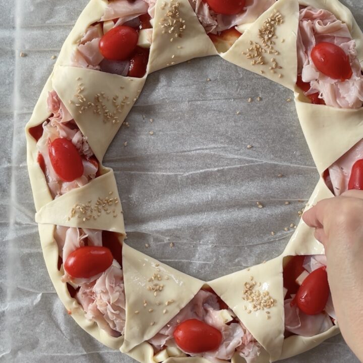 Ripiegate il bordo esterno e portate ogni spicchio verso di esso facendo una leggera pressione in odo da farlo attaccare, se avete difficoltà bagnate leggermente la pasta sfoglia.