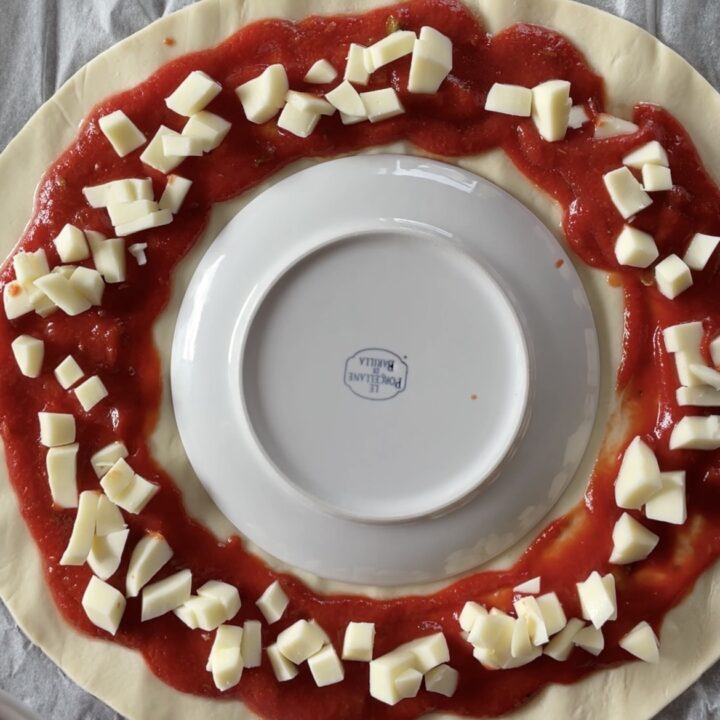 Mettete la passata di pomodoro precedentemente condita tutto attorno al piattino e senza arrivare al bordo della pasta sfoglia.
