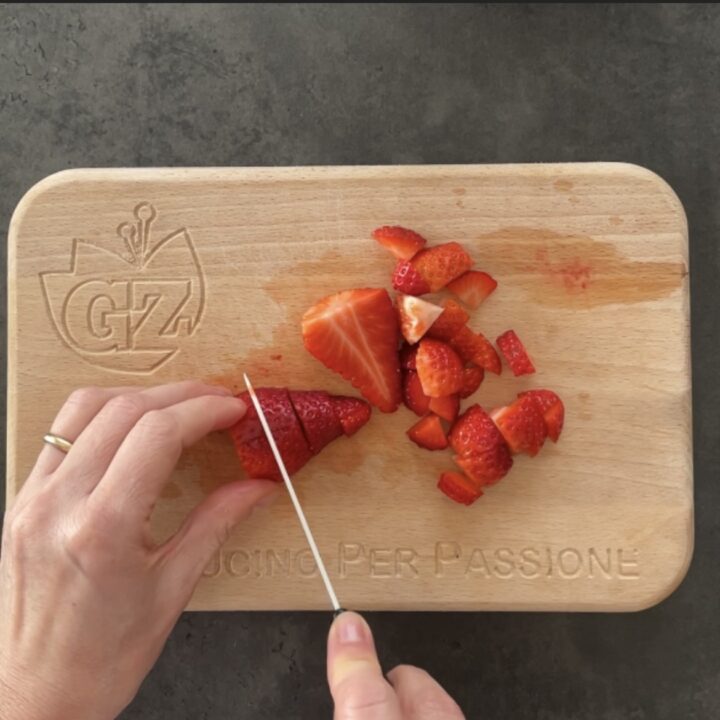 Iniziamo a preparare lo Zuccotto di colomba, lavate le fragole, eliminate la parte con le foglioline e tagliatele a piccoli pezzi.