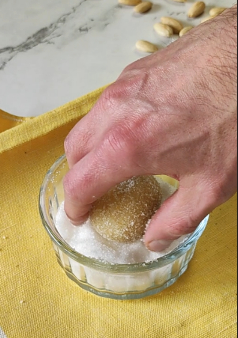 Prelevate porzioni di impasto, formate delle palline della grandezza di una noce e passatele nello zucchero semolato. Disponetele su una teglia rivestita di carta forno, ben distanziate. Posizionate al centro di ogni amaretto una mandorla intera.