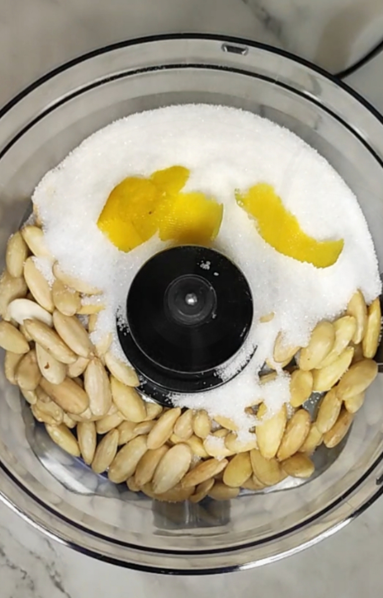Nel boccale del mixer ponete le mandorle, lo zucchero e la scorza di limone. Frullate il tutto fino a ottenere una farina fine ma non troppo.
