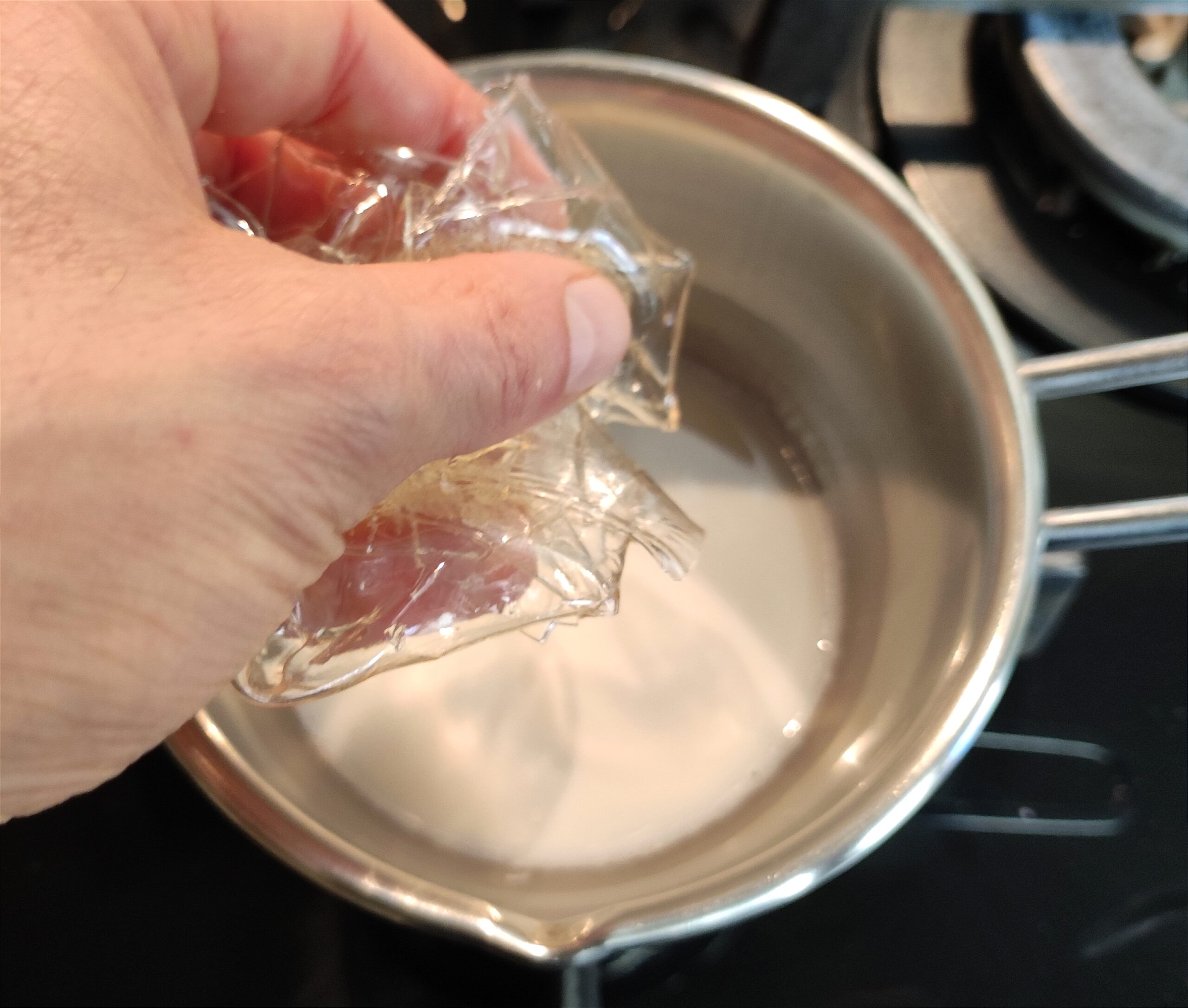 Mettete la gelatina in ammollo in acqua fredda per 5 minuti. Generalmente la quantità di acqua da utilizzare è 5 volte quella del peso della gelatina.