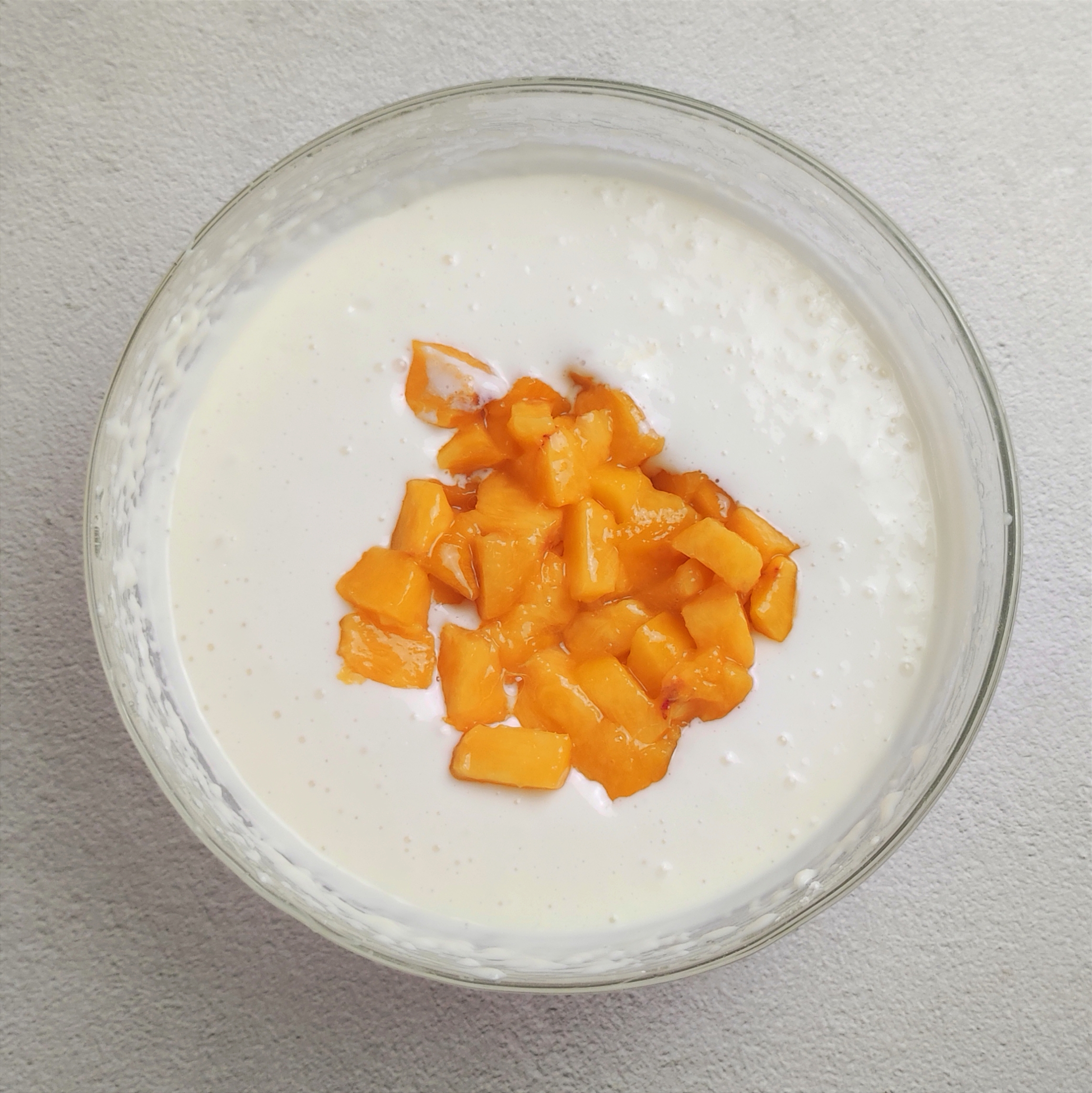 Mettete la gelatina in ammollo in acqua fredda per 5 minuti. Quindi strizzatela, unitela al latte leggermente scaldato e fatela sciogliere. Aggiungete il composto alla crema e inglobatelo per bene con le fruste. In ultimo aggiungete le pesche a cubetti e mescolate con una spatola.