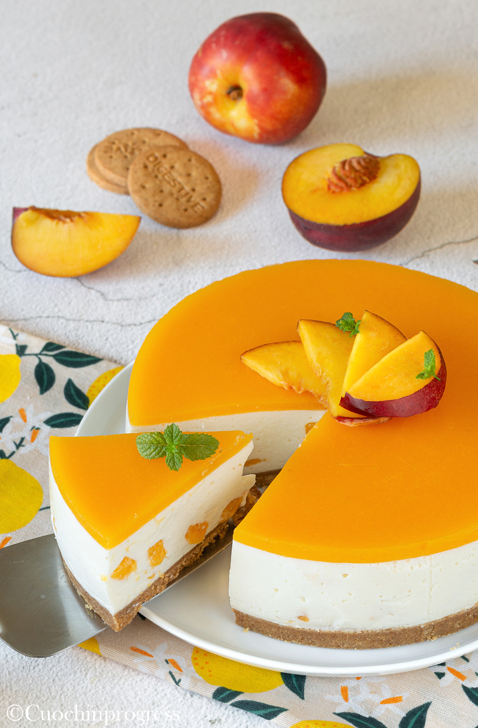La CHEESECAKE ALLE PESCHE è un dessert estivo fresco, goloso e dal sapore equilibrato, in cui la dolcezza ed il profumo delle pesche si sposa perfettamente con la cremosità della farcitura al formaggio. La base croccante di biscotti aggiunge una piacevole consistenza, rendendo ogni boccone un’esperienza indimenticabile.
