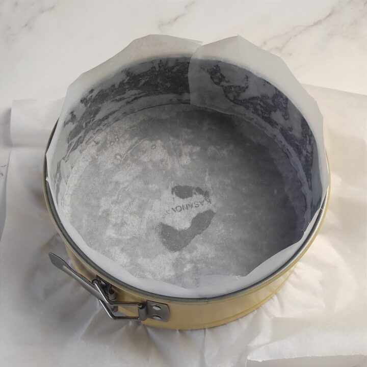 Imburrate uno stampo a cerniera da 20-22 cm e foderatelo di carta forno. La cosa fondamentale è che la carta forno sulle pareti fuoriesca di almeno di 5 cm dallo stampo, visto che in cottura la cheesecake basca tenderà a gonfiarsi molto.