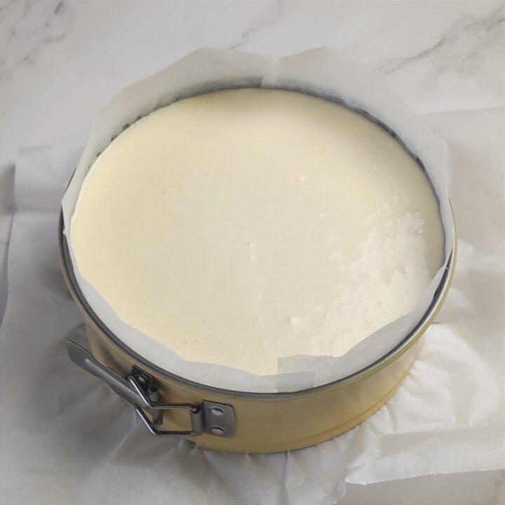 La cheesecake basca viene cotta in uno stampo rivestito di carta da forno, che le dona un aspetto rustico e imperfetto. Una volta tolta dal forno, deve essere lasciata raffreddare completamente, perché l’interno si rassoda leggermente, pur mantenendo un cuore soffice.