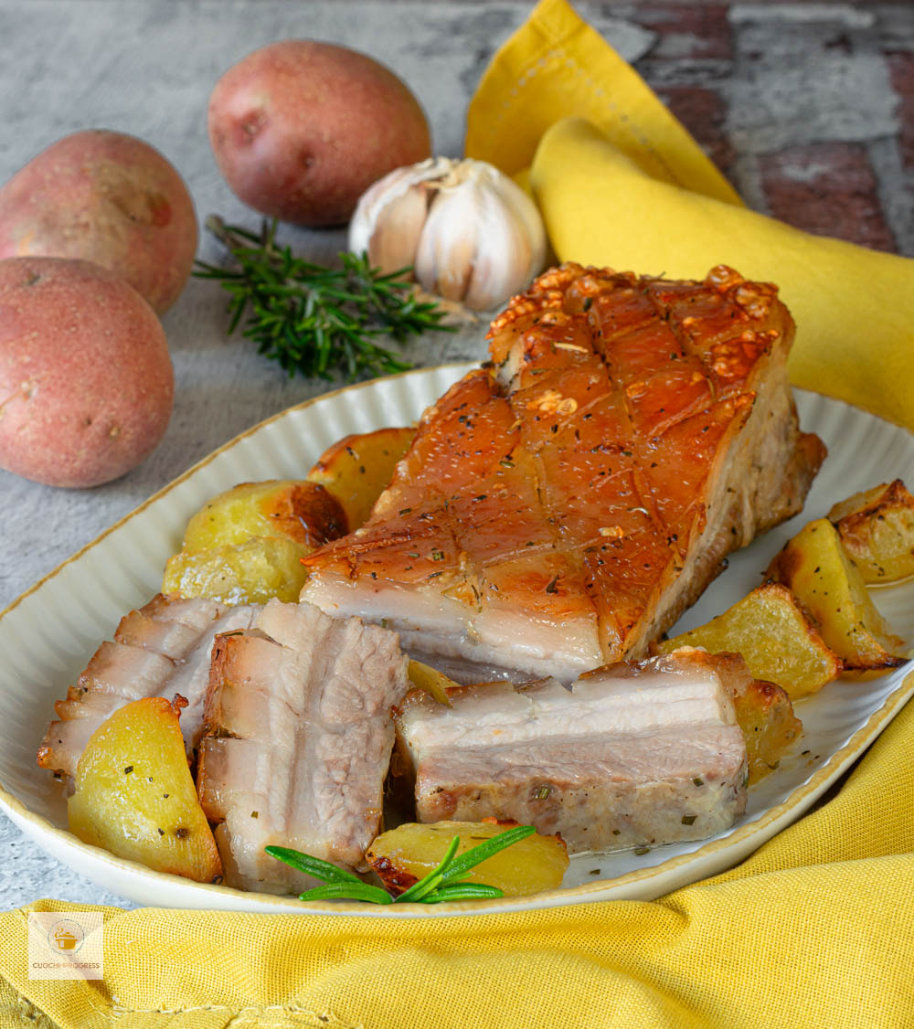 La PANCETTA DI MAIALE AL FORNO CON PATATE è un secondo piatto rustico e sostanzioso, perfetto per i pranzi in famiglia o per la tavola della domenica. La pancetta, cotta lentamente in forno, diventa incredibilmente tenera all’interno, mentre la superficie si trasforma in una crosticina dorata e fragrante che racchiude tutto il sapore della carne.