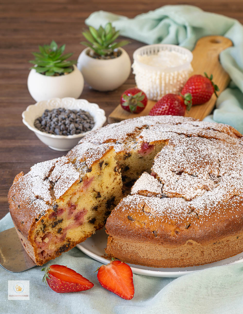 Aggiungete la farina, il lievito e il sale setacciati. Mescolate il composto fino a renderlo liscio e omogeneo. In ultimo unite le fragole e le gocce di cioccolato. Inglobatele delicatamente con una spatola. Versate l’impasto in uno stampo da 22 cm imburrato e infarinato.
