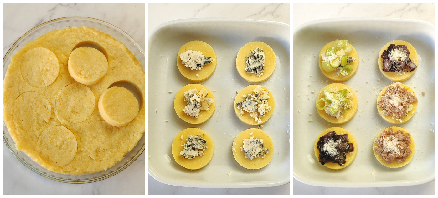 Una volta pronti gli ingredienti procedete con la composizione delle tartine. Su ogni cerchio di polenta mettete il gorgonzola e alternando gli ingredienti componete le tartine.