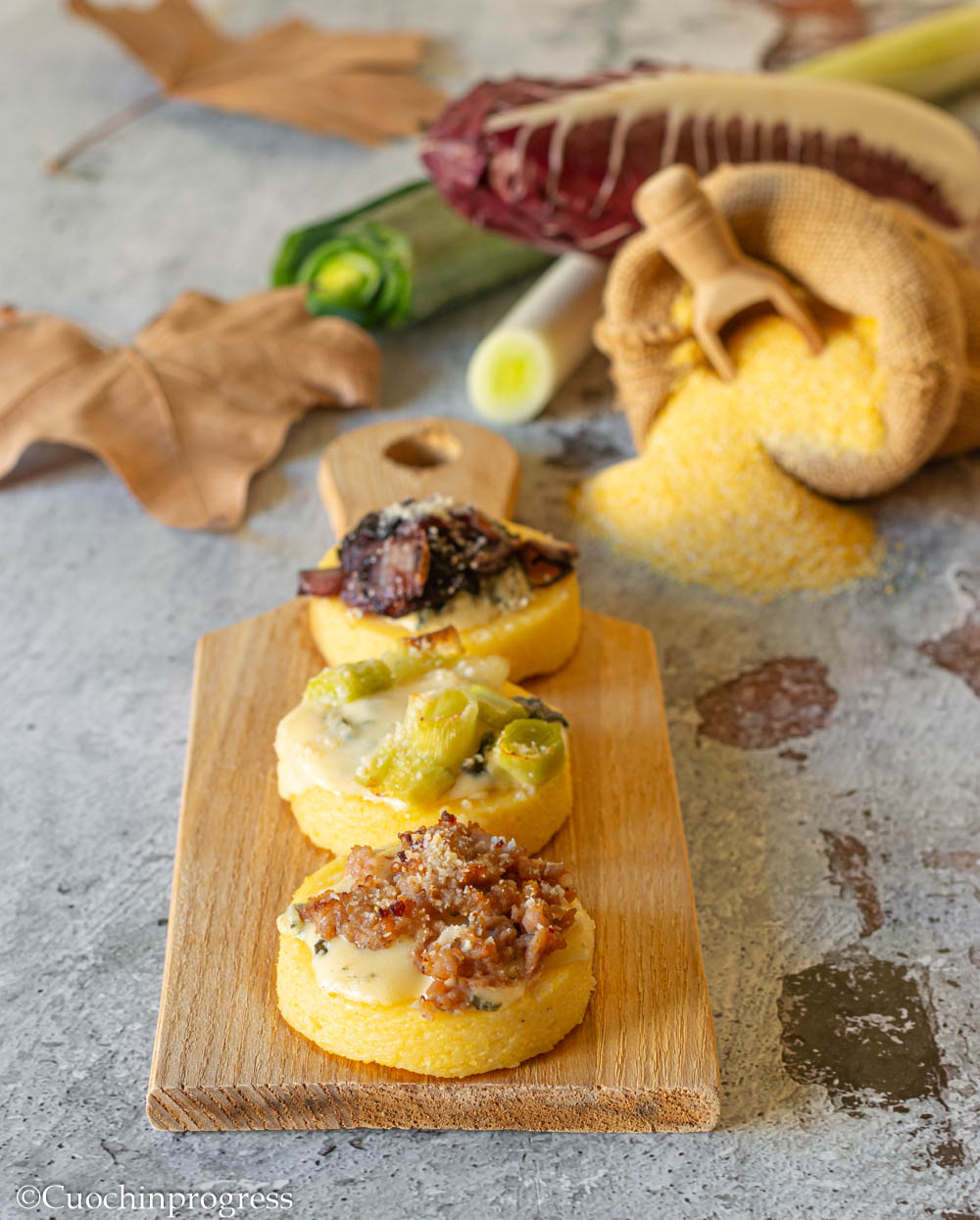Le TARTINE DI POLENTA sono un antipasto sfizioso e versatile, perfetto per aprire un pasto in modo gustoso e originale. Si preparano utilizzando una base di polenta, che può essere fatta in casa o acquistata già pronta.