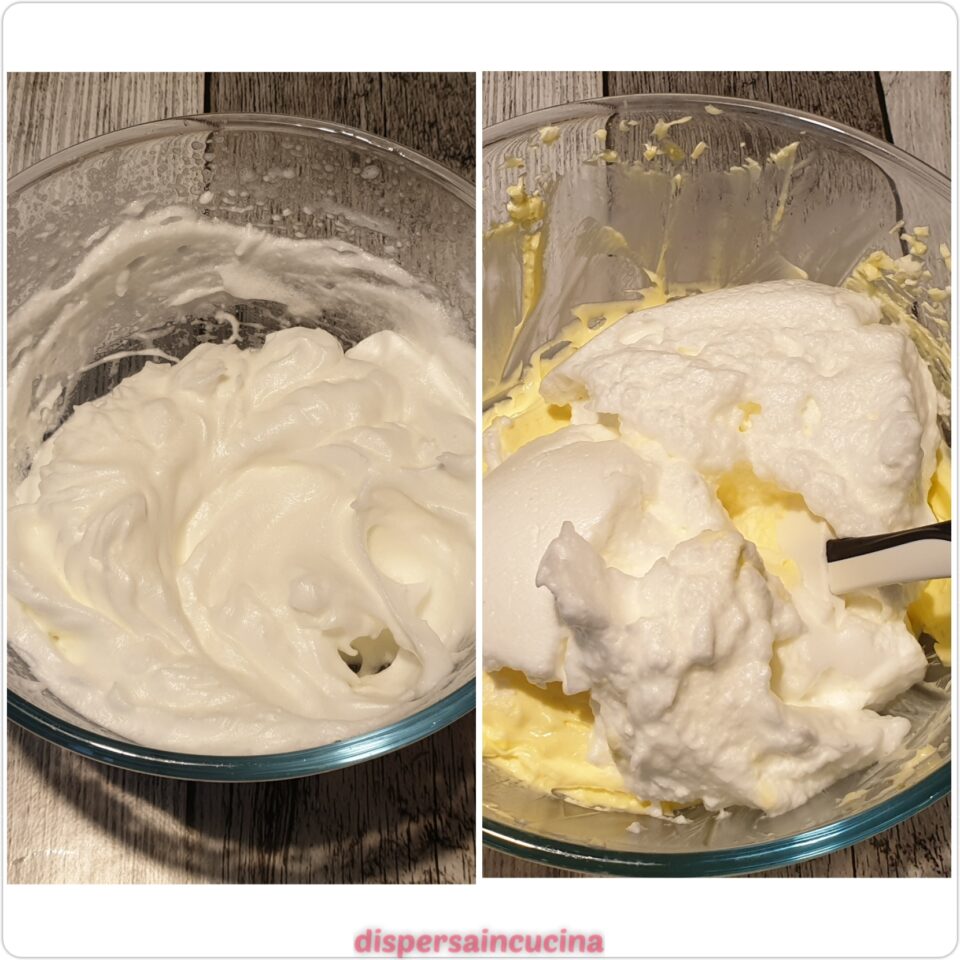 Sempre con l’aiuto della frusta, montare gli albumi a neve ferma. Anche questo passaggio è fondamentale per la densità della crema. Rovesciarli quindi con cura nella ciotola grande e mescolare delicatamente dal basso verso l’alto con una spatola.