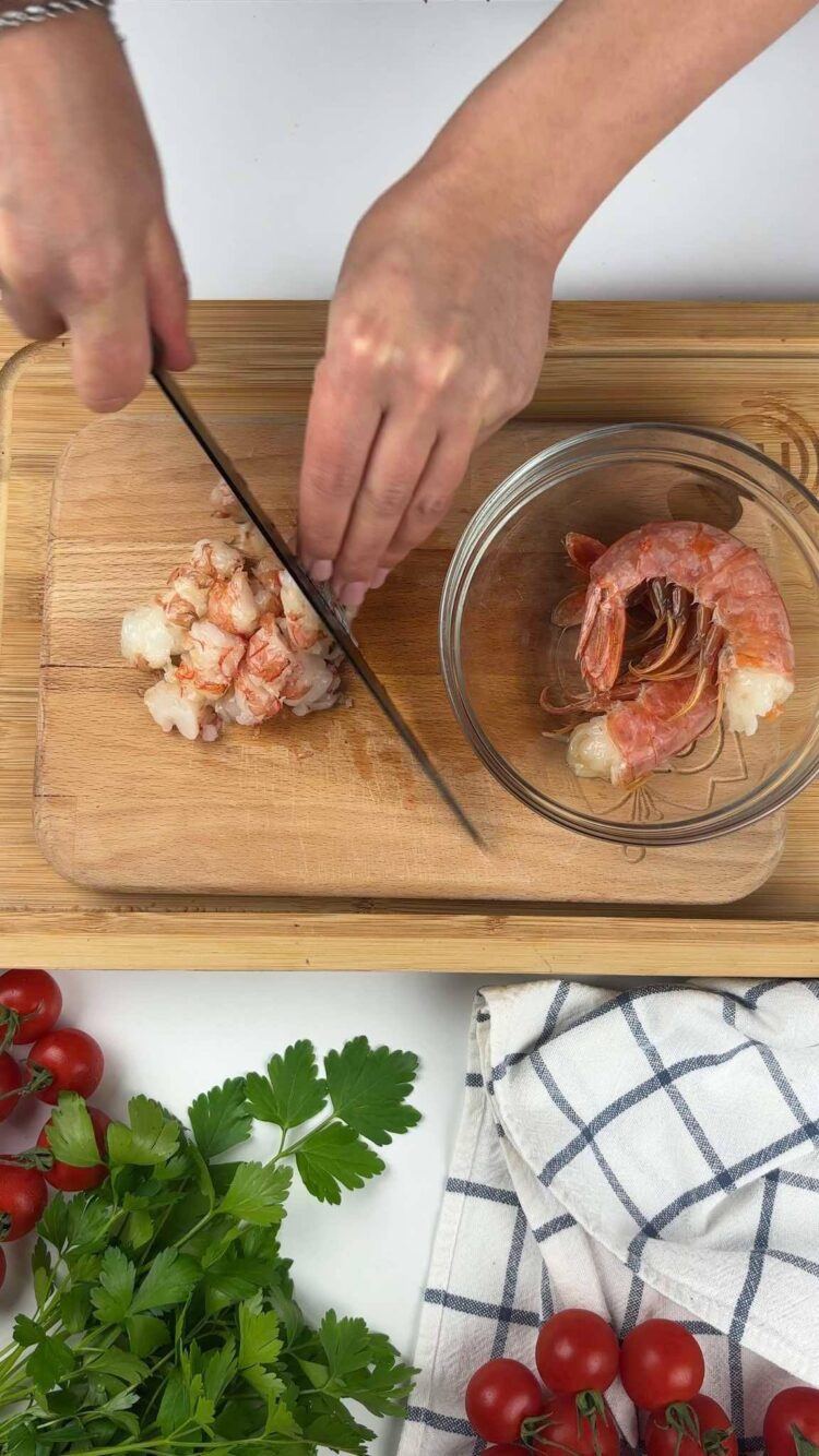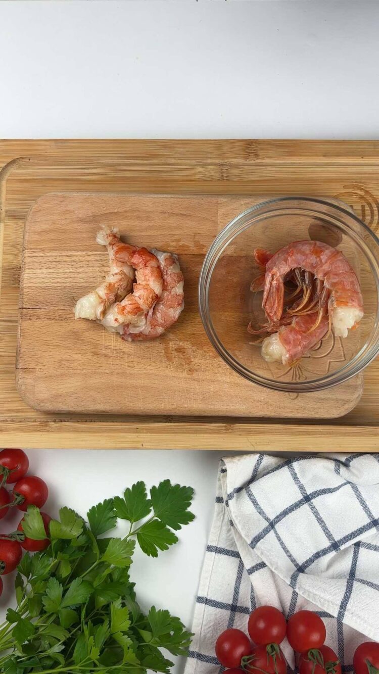 Per prima cosa, dovrai pulire accuratamente i gamberi, stacca le teste da tutti i gamberi, incidi sulla schiena con delle forbici in modo da facilitare l’estrazione dell’intestino. Sbuccia i gamberi e se preferisci, lasciane alcuni con il carapace, io solitamente preferisco lasciarne uno a persona, ma in questo caso, spesso abbondo e ne aggiungo alcuni. Dopo averli sbucciati e valutato se e quanti lasciarne interi, taglia a pezzetti i restanti.