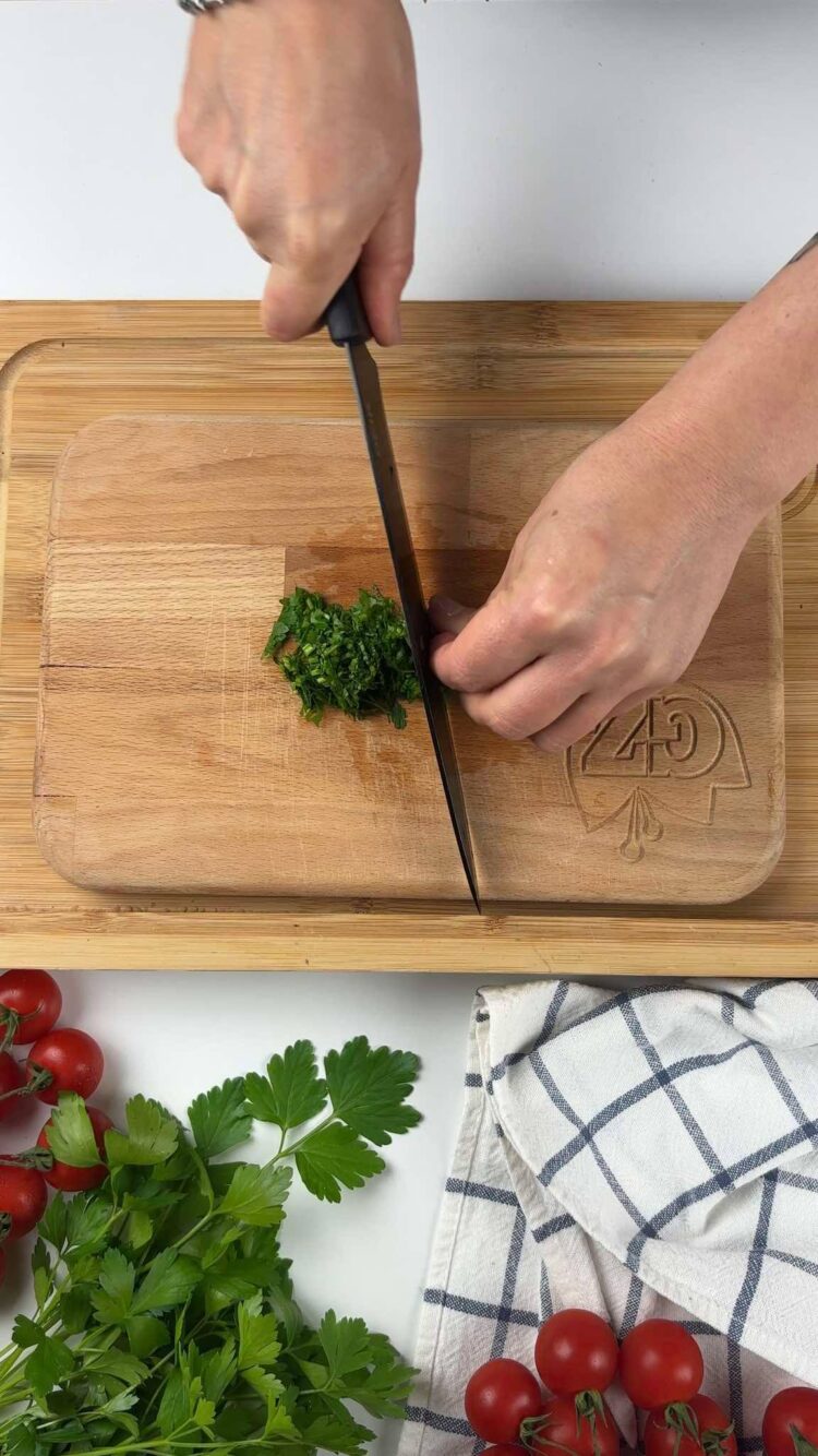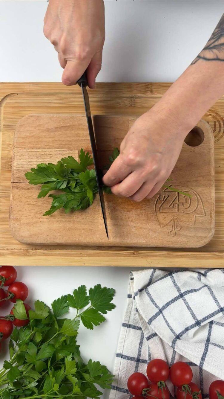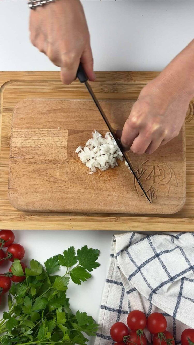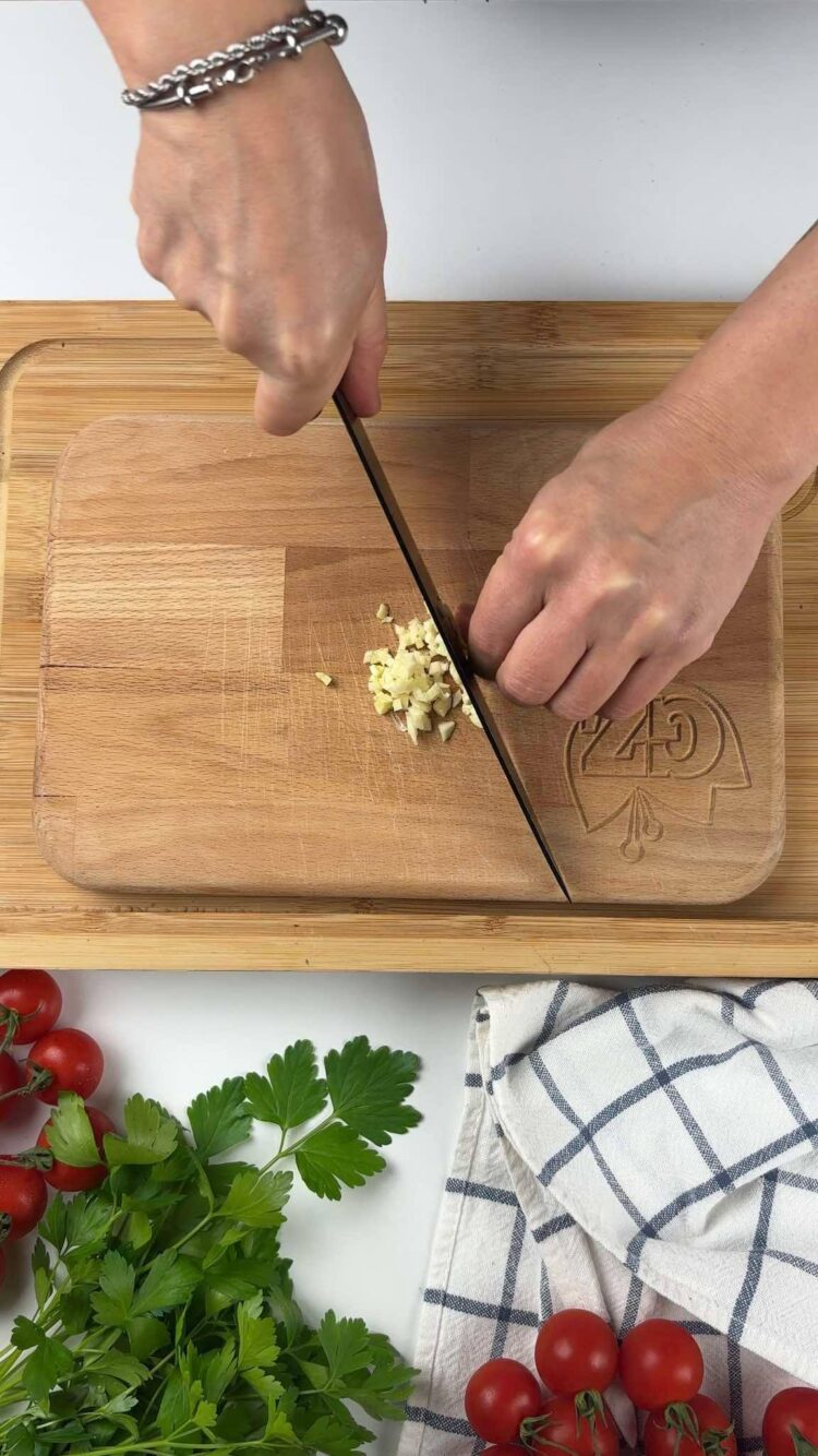 Trita uno spicchio d’aglio e uno spicchio di cipolla, trita anche un ciuffo di prezzemolo e tienilo da parte, ti servirà dopo, poi taglia i pomodorini a pezzetti, se sono pomodorini piccoli, puoi semplicemente tagliarli in 4 parti.