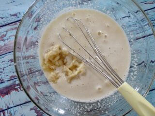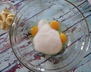 A parte ridurre in purea le banane e tagliare a pezzetti le mele (lasciandone un pò per la decorazione). Unire la frutta all’impasto e continuare a mescolare.
