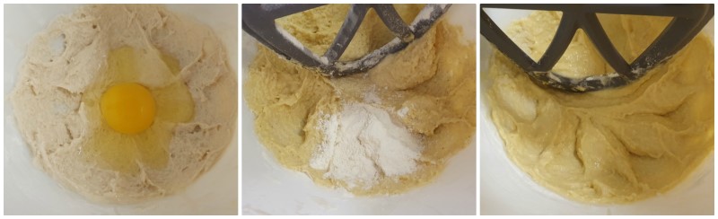 Quando inizia ad incordare, inserite 1 uovo alla volta, insieme a 2 cucchiai di farina e attendete sempre che l’impasto lo assorba, prima di aggiungere quello successivo. Lavorate gli ingredienti sempre a bassa velocità.