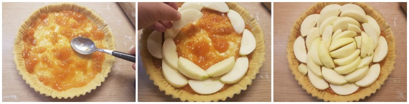 Sbucciate le mele e tagliatele a fettine di mezzo centimetro. Disponetele sopra la marmellata, partendo dal bordo esterno verso il centro.