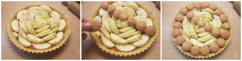 Stendete il resto della pasta frolla su un foglio di carta da forno infarinato e capovolgetelo sopra la vostra Crostata di mele e amaretti. Eliminate la pasta frolla in eccesso e sigillate bene i due bordi tra di loro.