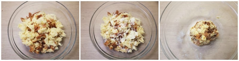Schiacciate il tutto con le mani in modo che la panna bagni il pandoro: in pochi attimi otterrete un impasto leggermente umido, con cui potrete modellare i vostri tartufini di pandoro.