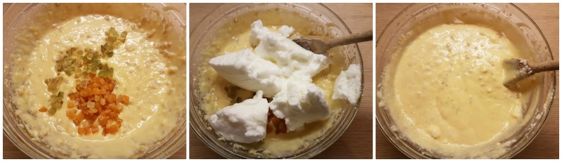 In ultimo, aggiungete il cedro e l’arancia candita e gli albumi montati a neve. Amalgamate delicatamente a mano, aiutandovi con un cucchiaio di legno o una spatola, in modo da non smontarli.