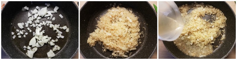 Rosolate la cipolla tagliata a dadini con un filo di olio extravergine di oliva.
