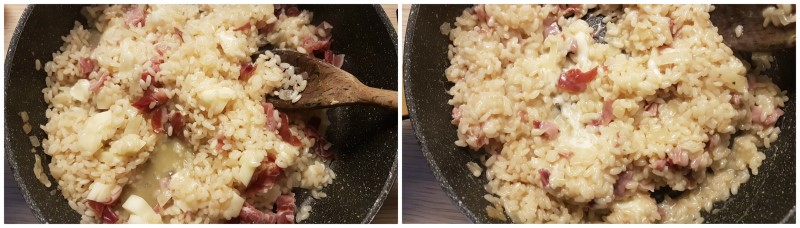 A fine cottura del riso, spegnete il fuoco, aggiungete scamorza e speck tagliati a dadini e il parmigiano.